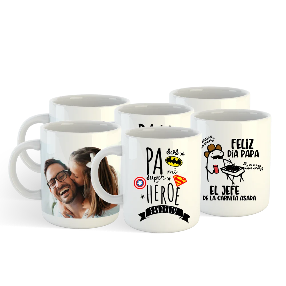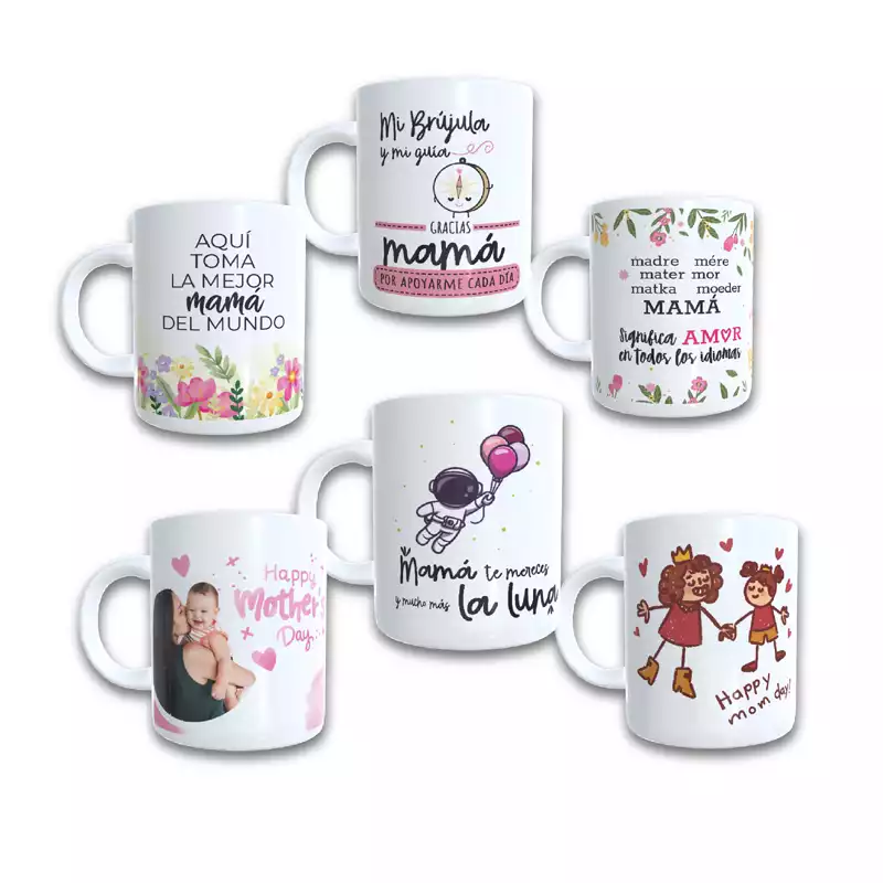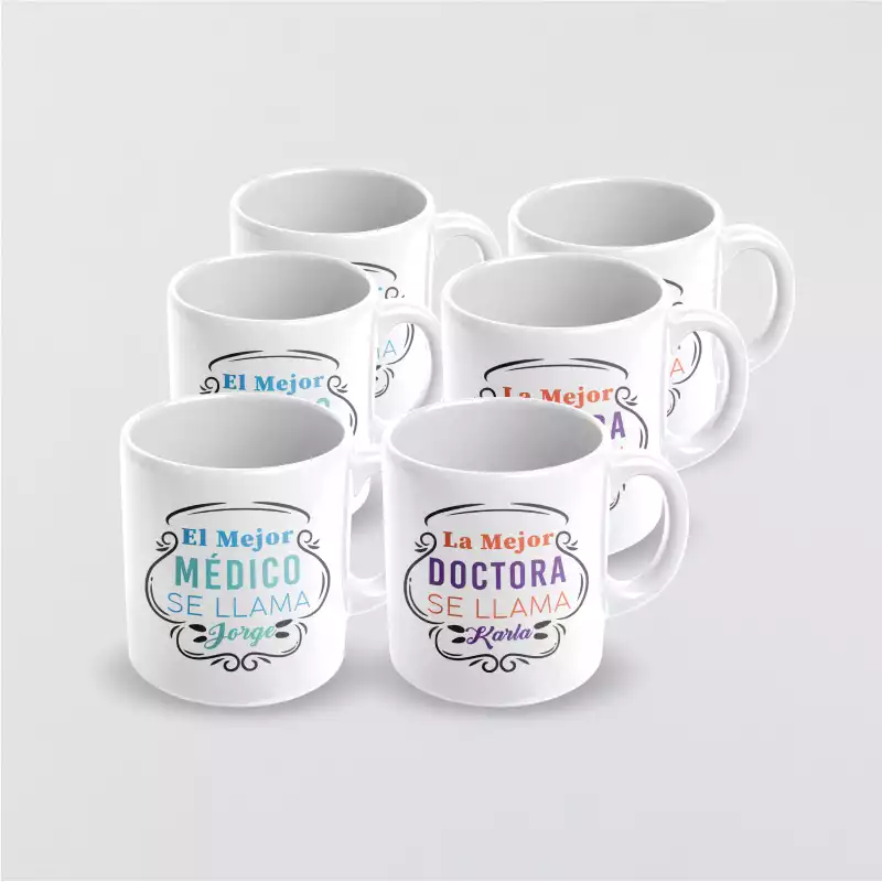 6 tazas blancas personalizadas con capacidad para 11 onzas, más 6 llaveros en acrílico troquelado medidas 2.25 pulgadas con impresión personalizada.