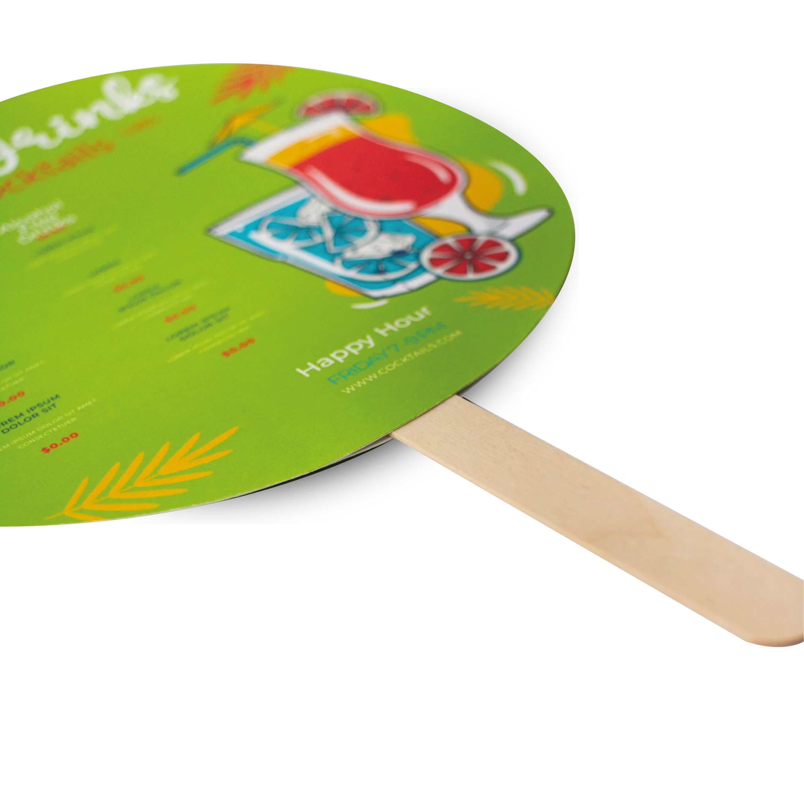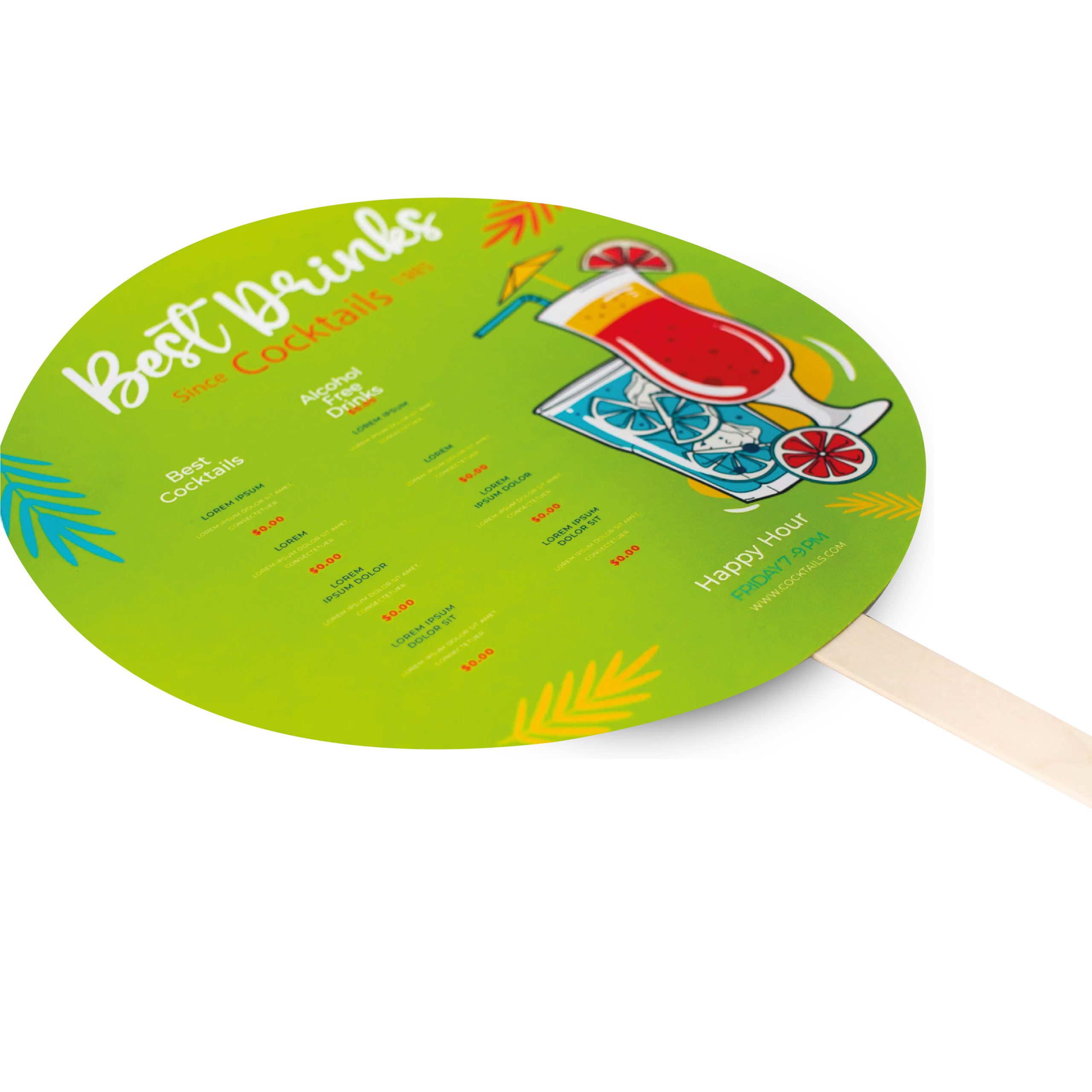 Abanico circular para empresas personalizado perfecto para tu negocio, sirve como elemento para promocionar tu marca dar a a conocer información. Hechos en papel foldcote con paleta de madera. Puedes colocar el logo de tu empresa, menú, QR, datos de tu negocio o tus redes sociales. Precios con IVA incluido.