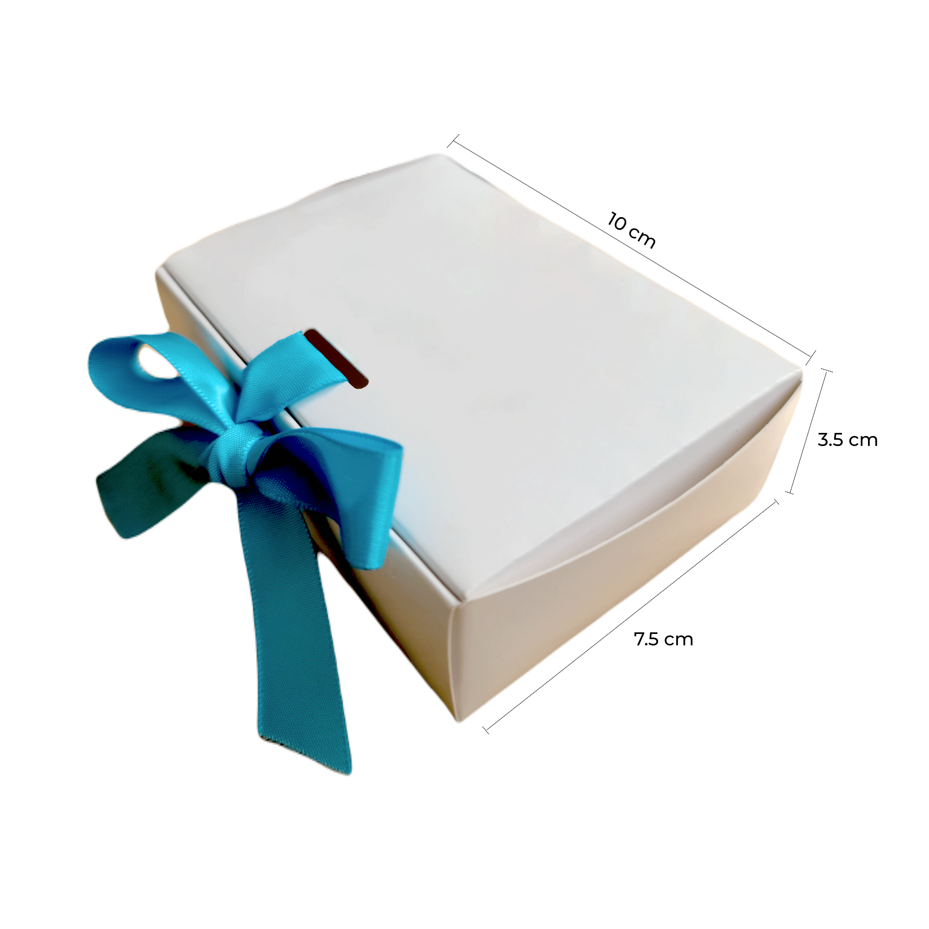 Caja personalizada tipo gaveta de 13×13×7 cms fácil de abrir (solo se desliza), puedes colocar una imagen o una frase en la tapadera o en los laterales. Usamos material reciclable, puedes elegir el color natural (café) o en color blanco.