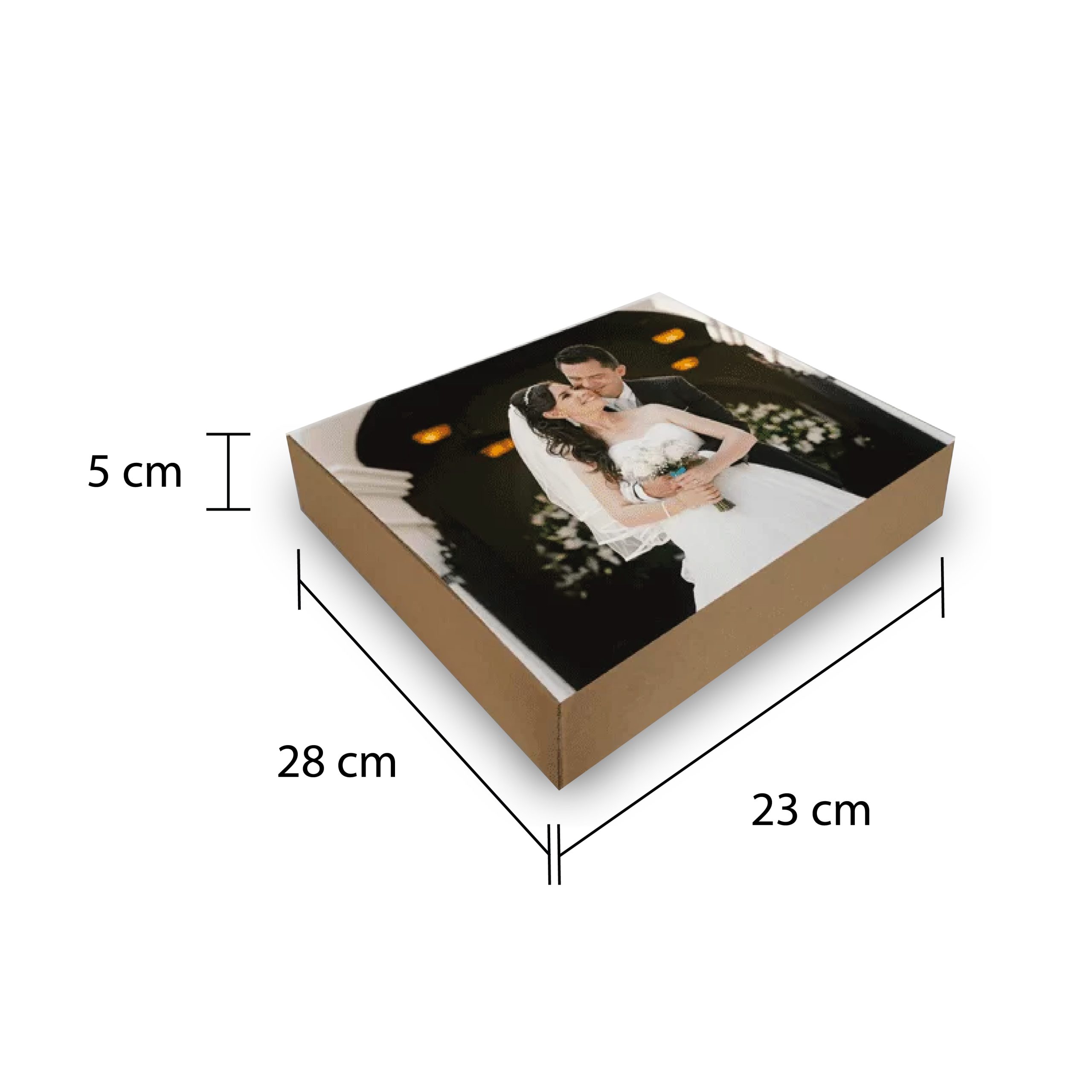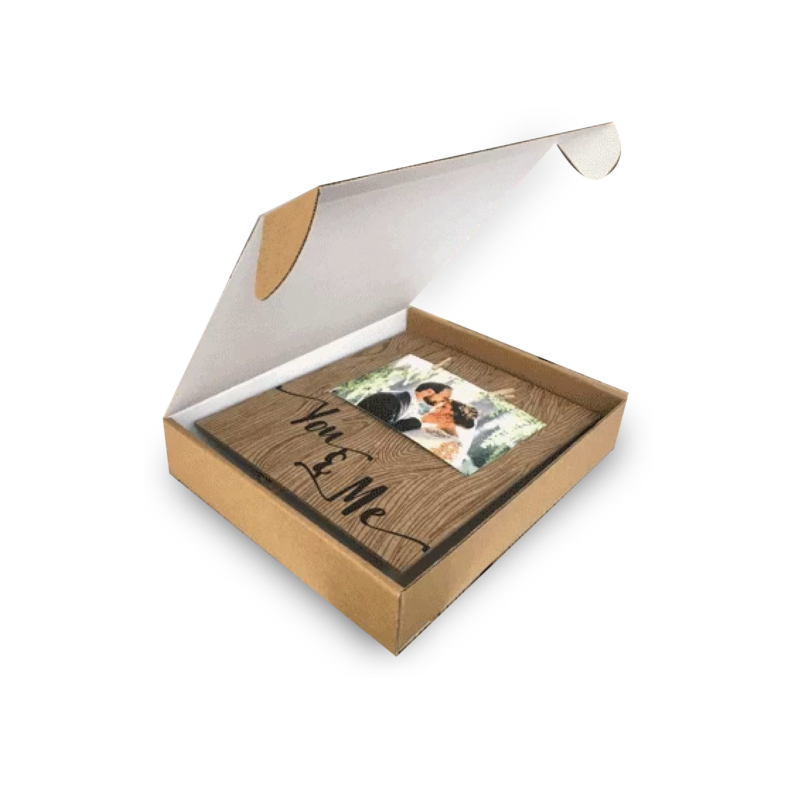 Caja personalizada tipo regalo de 24x15x10 cms fácil de abrir, puedes colocar una imagen o una frase en la tapadera o en los laterales. Usamos material reciclable, puedes elegir el color natural (café) o en color blanco.