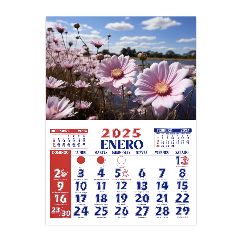 Calendario 2025 personalizado para colocar en pared, estilo Santoral medida final 15×21″ con 12 hojas a color (una por mes). La zona de personalización con impresión a color es de 15×11 pulgadas en material foldcote 12. Precios con IVA incluido.