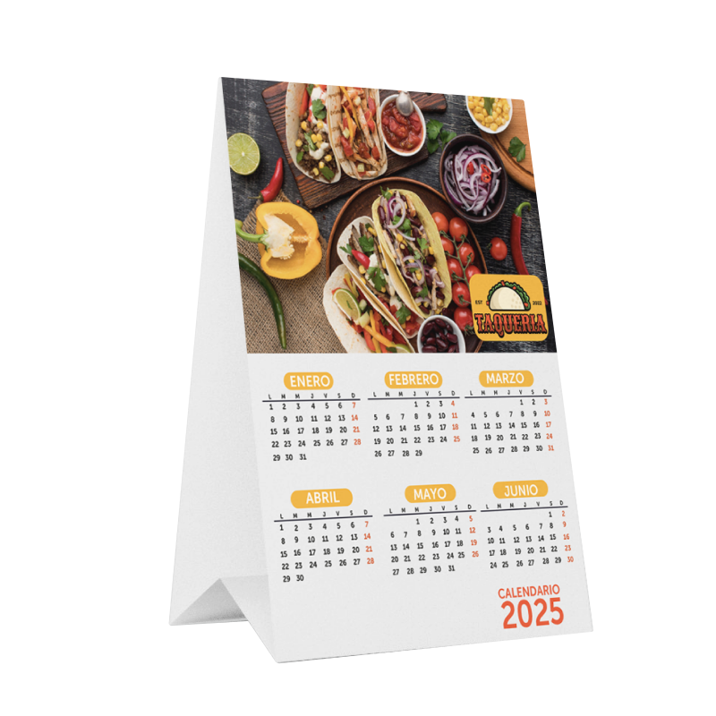 Calendario 2025 personalizado tipo tent card de 5.25×7.25 pulgadas con barniz en material Foldcote 12. Selecciona 2 de tus mejores fotos familiares o de tu marca. Por su forma es fácil de colocar en tu oficina o en un espacio en tu casa. Precios con IVA incluido.
